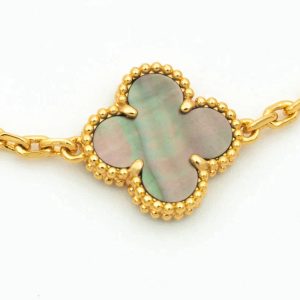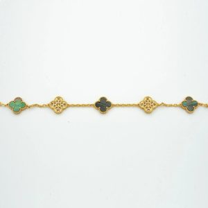 Embrace elegance and luck with our Clover Bracelet. Crafted with 5 motifs of intricately designed gold and sparkling diamonds, this bracelet is perfect for any occasion. Its delicate yet sturdy design will surely bring good fortune to its wearer. Add a touch of luxury to your jewelry collection today.
