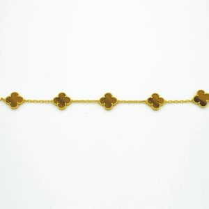 Add a unique touch to any outfit with the Clover Bracelet featuring five motifs of stunning carnelian and tiger eye gemstones. This bracelet is not only a beautiful accessory, but also carries the potential benefits of promoting energy, confidence, and balance in one’s life. Perfect for any occasion.