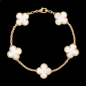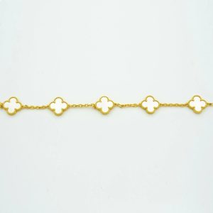 This exquisite bracelet embodies a timeless elegance with its five clover motifs crafted from agate and gold. The striking combination of materials creates a beautiful contrast, while the clover symbol represents good luck and fortune. A truly luxurious addition to any jewelry collection.